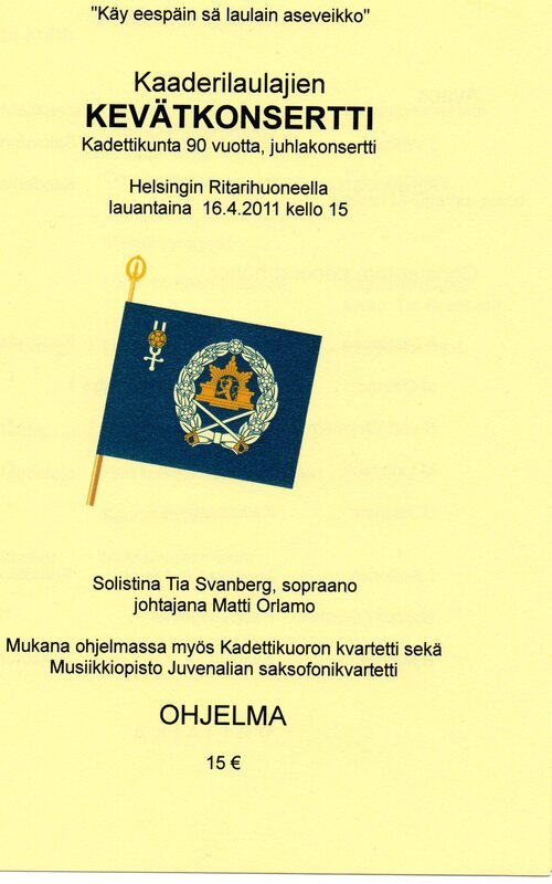 6.4. Ke, Eduskuntavaalien ennakkoäänestys, vaalitoimikunta Antinkodissa, hakkapeliittain kuukausilounas Ostrobotnialla kello 12.00, 7.4. To, Matka Turkuun, 8.4. Pe, Vaalitoimikunta Malmin sairaalassa, 9.4. La, Inkeriläisten ja karjalaisten heimoveteraanien vuosikokous kello 13.00 Inkerikeskuksessa, 11.4. Ma, Vaalitoimikunta Miljan palvelutalossa, 12.4. Ti, Vaalitoimikunta Syystien palvelutalossa, 14.4. To, MPKY:n seminaari Kokonaisturvallisuuden tulevaisuus HY:n juhlasali kello 17.30, 16.4. La, Kaaderilaulajien kevätkonsertti Ritarihuoneella kello 15.00, 17.4. Su, Eduskuntavaalit, vaalilautakunta Helsingin medialukiolla, 18.4. Ma, Helsingin kaupungin rintamaveteraaniasiain neuvottelukunnan kokous Laakson sairaalan tiloissa kello 12.00, 19.4. Ti, Senioriupseerien kerhon seminaari ja 60-vuotisjuhla Katajanokan kasinolla kello 14.00 alkaen, 20.4. Ke, Sotavahinkosäätiön talousvaliokunta kello 13.00 Nordeassa, 26.4. Ti, Helsingin kaupungin sotiemme veteraaneille tarjoama elokuva "Täällä Pohjantähden alla II" Bio Rexissä kello 12.00 ja kello 15.00, 27.4. Ke, Kansallinen veteraanipäivä, pääjuhla Turussa, seppeleen lasku Helsingissä Mannerheimin ratsastajapatsaalla kello 13.00, kahvitus veteraaneille HY:n juhlasalin lämpiöissä kello 14.00 ja Kaartin soittokunnan juhlakonsertti HY:n juhlasalissa kello 15.00, 29.4. Pe, Sotavahinkosäätiön kevätkokous ravintola Savoyssa kello 10.45, Kaartin Soittokunnan kevätkonsertti kello 19.00 Finlandia-talossa,