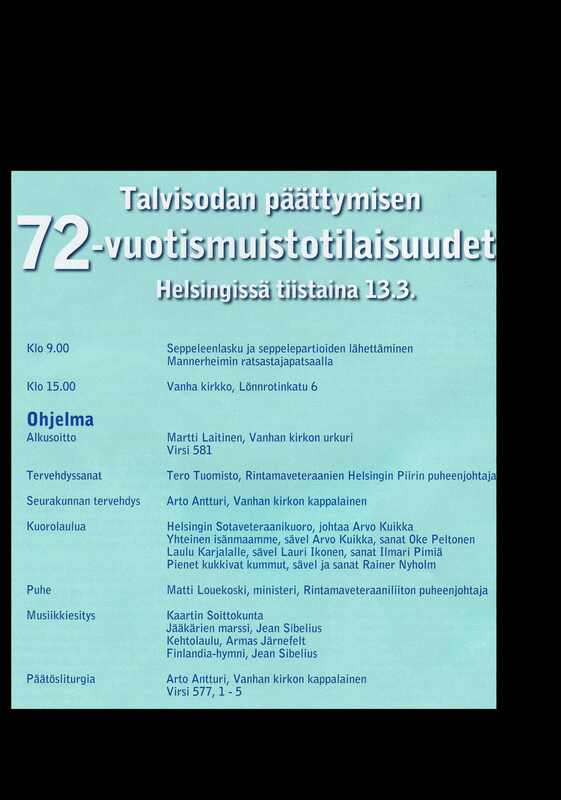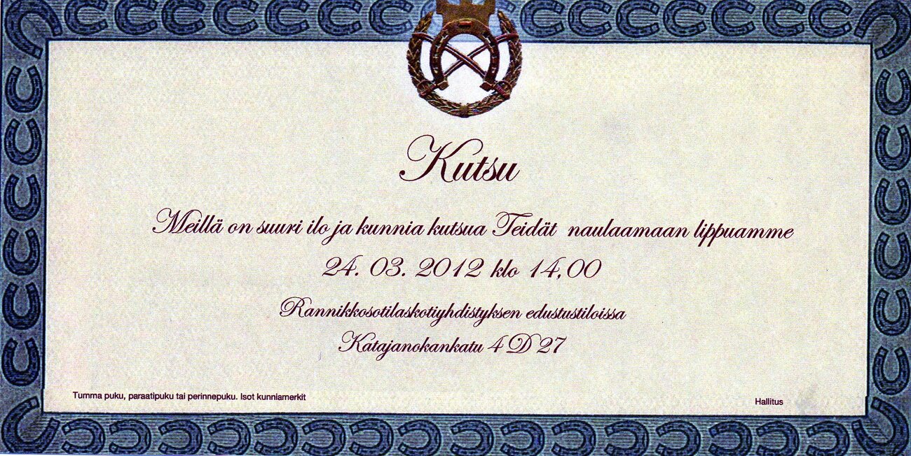 1.3. To, Muutostiimin kokous Kallion virastotalossa kello 12.00 - 16.00, 5.3. Ma, Tohlopinrivin yhtiökokous kello 18.00 Tesoman seurakuntakodissa, 7.3. Ke, Hakkapeliittayhdistyksen vuosikokous kello 12.00 Ostrobotnialla, valtiosihteeri Marcus Rantala: Ajankohtaista puolustusvoimauudistuksesta, 13.3. Ti, Talvisodan päättymisen muistojuhla kello 9.00 Mannerheimin ratsastajapatsaalla, muistojumalanpalvelus Vanhassa kirkossa kello 15.00, 14.3. Ke, Nordean säätiöseminaari kello 14.00 Nordean pankkisalissa, 15.3. To, Helsingin väestönsuojeluyhdistyksen kevätkokous vss-museossa kello 18.00, 17.3. La, MPKL:n liittovaltuuston kokous Helsingissä kello 12.00, Ratsumieskillan vuosikokous kello 13.00 Lahden Hennalassa, 24.3. La, Uudenmaan Sotaveteraanipiirin vuosijuhla Nurmijärvellä, juhlalounas kello 11.30, kirkko ja juhla kello 12.45, Reserviratsastajien lipunnaulaus kello 14.00, 27.3. Ti, Valtiotieteen tohtori Hannu Rautkallion uusimman kirjan "Rytin sotavuosien muistelmat" julkistaminen Helsingin Taidehallin ravintolassa kello 9.45, Matu-toimikunnan kokous kello 11.30 Katajanokan kasinolla, Pohjola Pankki Oyj:n yhtiökokous kello 14.00 Messukeskuksessa, Pohjois-Helsingin Reserviupseerien vuosikokous kello 18.30 Ammattienedistämislaitoksella, 28.3. Ke, Maanpuolustusjuhla kello 17.00 ravintola Pisarassa Tampereella, 31.3. La, Kadettikunnan turvallisuuspoliittinen seminaari Tampereen yliopistolla kello 13.00 - 15.00,