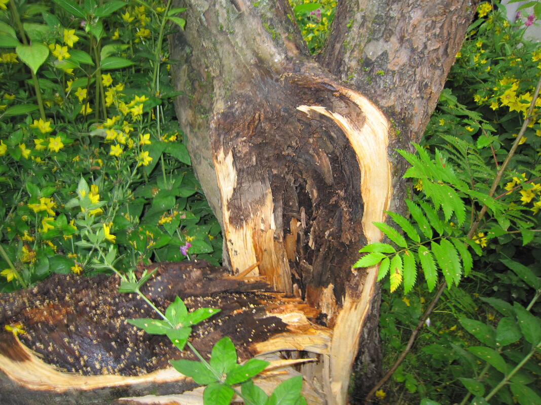 29.7. Su, Siltamäen pihan vanha omenapuu ei kestänyt heinäkuun lopun ukkosmyrskyä eikä runsasta omenasadon painoa.