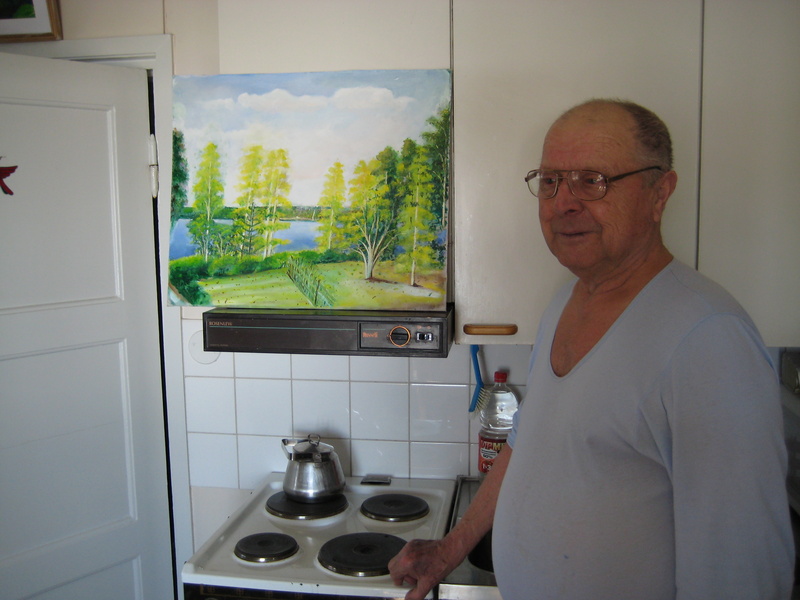 Toinen mukava asia, jonka toteutin aina ollessani Punkarjulla, oli käydä tapaamassa inkeriläisiä ja karjalaisia heimoveteraaneja. Niinpä tälläkin matkalla poikkesin tervehtimään Juho Savolaista ja hänen vaimoaan. Juho Savolainen taitava, itseoppinut öljymaalari viimeisteli juuri keittiön pöydän ääressä maisemamaalaustaan. Otin kuvan tekijästä ja hänen työstään heidän keittiössään sekä Juho Savolaisesta ja hänen vaimostaan Inkeri-talon portailla. Punkaharjulla asuu edelleen noin parikymmentä inkeriläistä heimoveteraania ja heidän leskeään. Oli mukava tavata heitä, kun kauan sitten olin mukana heitä Punkaharjulle sijoitettaessa.