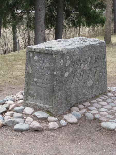 Seuraava kohteemme oli Saksanniemen Järjestyslipuston muistomerkki nykyisen Saksanniemen koulun pihassa Porvoon joen läheisyydessä. Muistomerkki on pystytetty Saksanniemen Järjestyslipuston tai Ratsupoliisikoulun alkuvaiheiden 1.9.-17.11.1917 muistoksi. Koulun oppilaat joutuivat puutteellisesti varustettuina Vapaussodan alussa taisteluun punaisten kanssa ja joutuivat perääntymään eri teitä aina Etelä-Pohjanmaalle asti, jossa Järjestyslipustosta täydennysten jälkeen perustettiin Mannerheimin käskystä vuoden 1918 alkupuolella Uudenmaan Rakuunarykmentti. Vaikka Saksanniemen Järjestyslipuston merkitys jäi sotilaallisesti vähäiseksi, jäi sen nimi elämään Vöyrin marssin kertosäkeessä: "Hei, Saksanniemi, jääkärijoukko, Lapuan ja Härmän joukko, Vöyri, Kauhava ja muut."