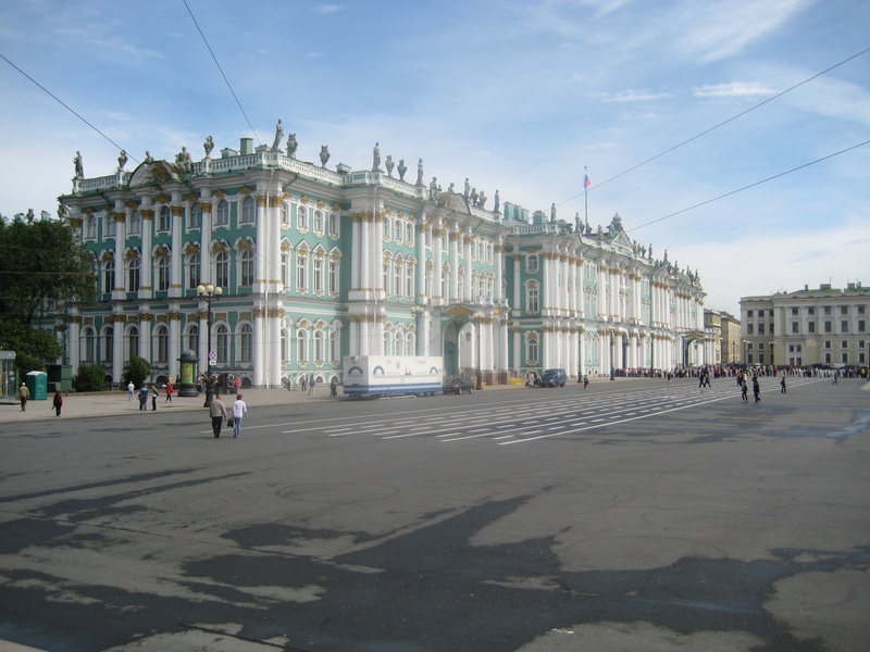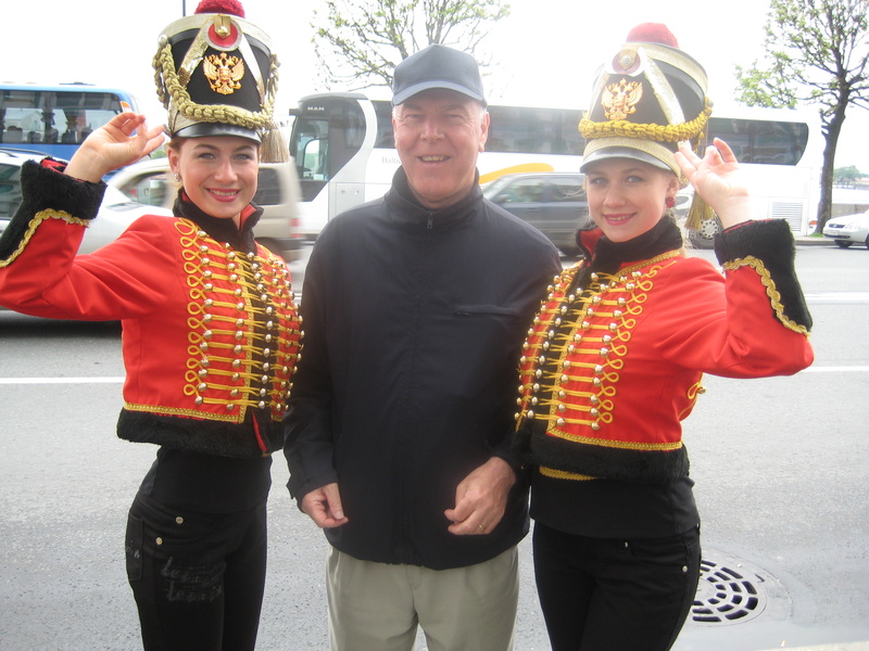 Jätettyämme matkatavaramme hotelliin lähdimme tutustumaan nähtävyyksiin.Tulopäivä oli hieman sateinen ja varustimme itsemme sateensuojin ja sadetakein. Kävelimme hotellilta miltei suoraan Eremitaasin jonoon. Meille jonossa oleville turisteille yritettiin myydä kaikenmoista tavaraa: karttoja, kirjoja ja muita matkamuistoesineitä. Emme kuitenkaan ostaneet mitään, mutta sen sijaan kuvautimme itsemme kahden viehättävän neitosen välissä, joilla oli päällään ratsuväen punainen nyöritakki. Kuvaus maksoi 100 ruplaa per kuva. Emme katuneet rahan tuhlausta. Ainakin tämä maksettu kuva täytyy liittää muistona tähän juttuun.