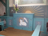 Kun Eeva-Leenan entiset kollegat Helena Rautiainen ja Sinikka Aalto saapuivat aamusella 29.6. Tampereelle vieraaksemme, olimme suunnitelleet, että ajamme Tampereelta suoraan Sastamalaan katsomaan Tyrvään Pyhän Olavin kirkkoa. Kirkko tuhopoltettiin vuonna 1997 ja otettiin jälleen käyttöön korjattuna 2003. Niinpä ajoimme Tampereelta suoraan Sastamalaan ja ehdimme juuri ensimmäiseen kirkon ja uusien maalausten esittelykierrokseen. Kirkkomaalausten tekijöiksi oli vuonna 2004 valittu taiteilijapari Osmo Rauhala ja Kuutti Lavonen, jotka työskentelivät neljän vuoden ajan aina kesäisin kirkossa. Maalaukset valmistuivat lopullisesti viime kesän lopulla. Niitä on yhteensä 101.