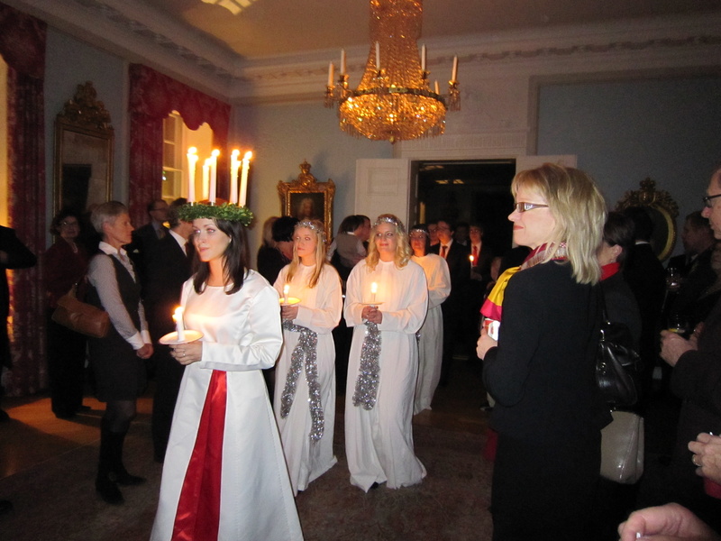 Ruotsin Helsingin suurlähetystö on jo usean vuoden ajan kutsunut meidät Lucian päivänä glögille ja katsomaan siellä vierailevaa Lucia-neitoa. Tämä suurlähetystön kutsu poikkeaa tavanomaisesta siinä, että vieraiden joukossa on paljon lapsia, mutta mukana on myös politiikan vaikuttajia eri puolueista ja valtion virkamiehiä. Tällä kerralla vieraita oli tavallista vähemmän. Liekö kylmä ja tuulinen sää vähentänyt vieraiden määrää? Tavallista väljemmältä näytti lähetystössä. Mukavaa kuitenkin oli ja tumma, lähetystössä vieraillut Lucia-neito tuli nähtyä ja kuvattua.