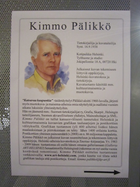 Toinen näyttely, jossa kävin jo seuraavana päivänä Helsingissä oli vanhan ystäväni ja reserviläiskaverini Kimmo Pälikön näyttely Katoavaa kaupunkia Sanomatalon Mediatorilla. Kimmo Pälikkö on jo lähes viiden vuosikymmenen ajan piirtänyt ja kuvannut katoavaa Helsinkiä. Hän on ikuistanut kynällään ja pensselillään vanhoja helsinkiläisiä rakennuksia, jotka ovat vuosien ja vuosikymmenten kuluessa purettu ja korvattu uudella. Omassa pienessä kokoelmassani on ainakin viisi Kimmo Pälikön työtä, joista rakkain on hänen uniikki grafiikkatyönsä Pohjoisrannan talvea 1983, jonka sain vastaanottaa Oy Esmi Ab:n lähtölahjana vuonna 1985, kun siirryin sieltä pois. Kimmo Pälikön piirtämiä Helsinki-aiheisia postikortteja on painettu huikeat 86 miljoonaa kappaletta.