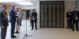 Sotilaspastori Kari Mannermaan puheen jälkeen kirkkoherra Takkinen, sotilaspastori Mannermaa, kenraalimajuri Raimo Jyväsjärvi ja Ylöjärven Sotaveteraanien kunniapuheenjohtaja Aarre Palin ja puheenjohtaja Mikko Selin siirtyivät paljastettavan muistotaulun luo seurakuntakeskuksen tuloaulaan.
