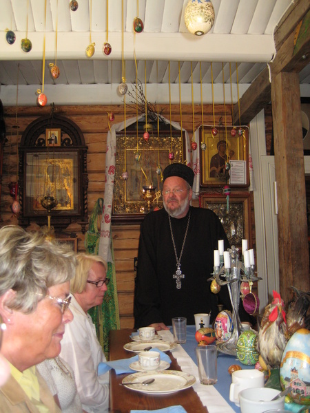 Olimme sopineet, että veljesyhteisön perustaja, ravintoloitsija Hariton Tuukkanen, joka nykyisin on ortodoksipappi kertoo meille veljesyhteisön ja kirkon perustamisesta. Sovittuna aikana hän saapuikin mustassa papin kaavussa ja sauvaan varaten entiseen hevostalliin, nykyiseen Pokrovan ortodoksikirkoon. Kyllä hänellä riittikin kertomista hevostallin muuttamisesta kirkoksi, sen ikonien hankkimisesta, maalaamisesta ja muiden kirkollisten esineiden kuljettamisesta Venäjältä. Kuuntelimme varmasti toista tuntia hänen huumorilla höystämiä tarinoitaan siitä, miten talli pala palalta muuttui kirkoksi. Valtaosa kirkon tarvikkeista saatiin lahjoituksina tai ne löytyivät kaatopaikoilta.