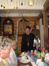 Kirkko-opastuksen jälkeen siirryimme hänen johdollaan kirkosta Villa Dannebrogiin, jonka ruokasaliin meille oli katettu lounas. Saimme lounaaksi lohta moskovalaiseen tapaan ja jälkiruoaksi makeaa piirakkaa kahvin ja teen kera. Ruoan valmistamisesta ja tarjoilusta huolehti munkki Foma. Hyvä ruoka ja kauniisti katettu pöytä jäivät meidän jokaisen mieleen.
