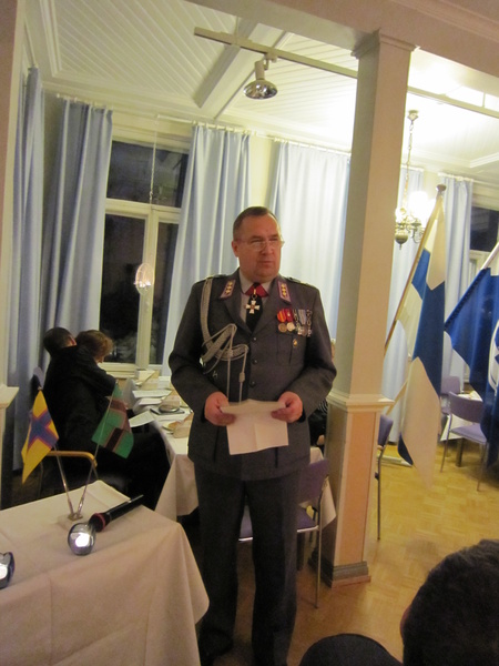 Yhdistyksen puheenjohtaja Hans-Göran Gabrielsson toivotti vieraat tervetulleiksi juhlaan, jonka jälkeen Etelä-Suomen Sotilasläänin esikuntapäällikkö, eversti Keijo Suominen piti juhlapuheen ja loi siinä katsauksen inkeriläisten ja karjalaisten heimoveteraanien vaiheisiin niin sodan kuin rauhan vuosina. Hän toi myös puolustusvoimien ja Etelä-Suomen Sotilasläänin tervehdyksen juhlaan.
