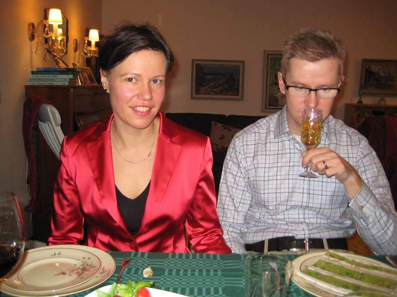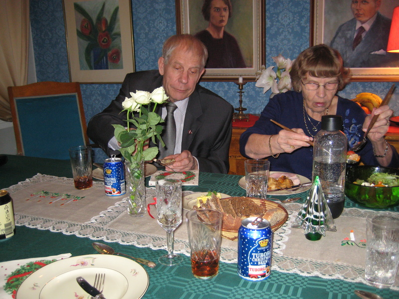 Jouluaattoaamuna nousimme varhain ylös ja aloimme valmistautua päivän kiireisiin. Aloitimme aamun poikkeuksellisesti lasillisella sampanjaa ja kahviaamiaisella. Sen jälkeen kiiruhdimme nostamaan Suomen lipun rivitalomme lipputankoon. Minä nostin lipun ja Eeva-Leena lauloi "Siniristilippumme...".