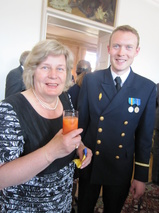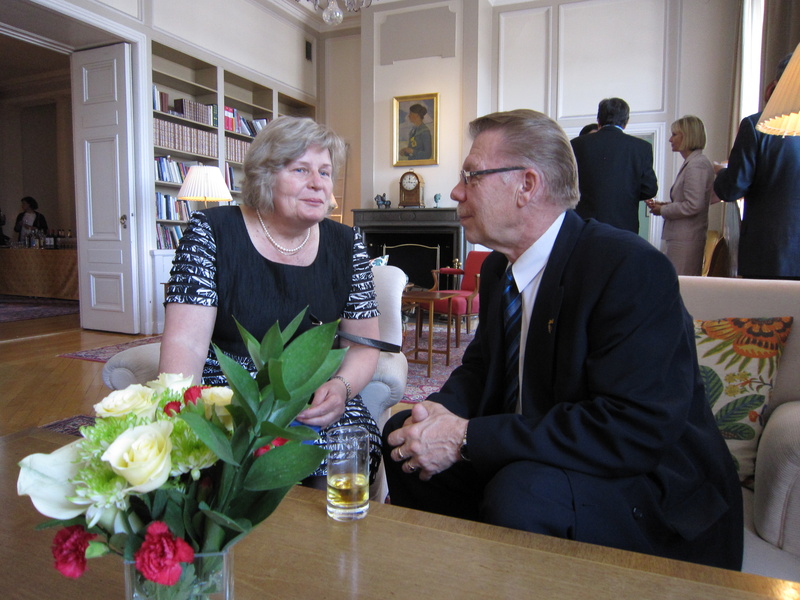 Kiertelimme ja kaartelimme vieraiden joukossa, jossa aina välillä tapasimme tuttuja. Aivan tuoreisiin tuttavuuksiimme kuului Ruotsin sotilasasiamiehen apulainen Henric Arnoldsson, johon tutustuimme lähetystössä kunniamerkin luovutustilaisuudessa. Hän kertoi puolestaan nähneensä meidät Pian syntymäpäiväaterialla sunnuntaina kesäkuun kolmantena Porvoon Sinne-ravintolassa Taide-tehtaalla, jossa hän oli ollut lounastamassa. Hän kertoi, että ei kehdannut tulla häiritsemään meitä ruokaillessamme siellä. Näin on Suomi pieni maa!