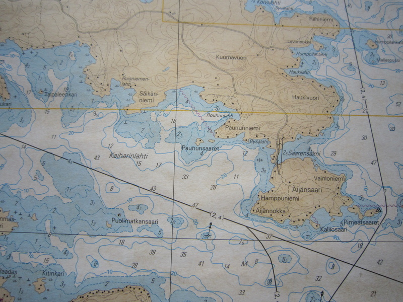 Lähestyessämme lounaspaikkaamme, 100 vuotta vanhaa, apteekkari Borgin entistä huvilaa muistelimme, kuinka joskus 1990-luvun alussa meillä oli ajatuksia hankkia saari läheisestä Kaiharin lahdesta. Onneksi hankkeesta ei tullut mitään. Meidän rahamme ja voimamme eivät olisi riittäneet saaressa asumiseen ja olemiseen. Sen verran hankalia nuo saarimökit meidän mielestämme olivat ja ovat. Hyvä näin! Laitan kuitenkin oheen kuvan kartasta ja saaresta, joka silloin oli kaupan.