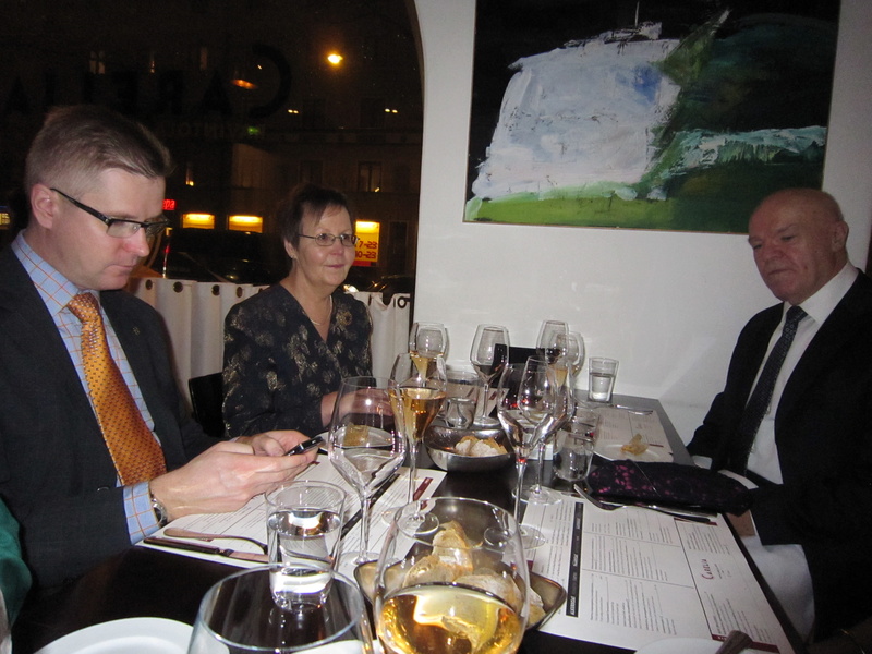 Mikko ja Pia antoivat meille ja Pian vanhemmille joululahjaksi liput Kansallisoopperan uudenvuodenaaton näytökseen La Traviata (säveltäjä Giuseppe Verdi) Kokoonnuimme "koko suku" Valveet ja Strandvallit ennen oopperaa yhteiselle aterialle ravintola Careliaan. Ravintolan ruoka: leppäsavustettu siika, puna- ja piparjuuren kanssa sekä jälkiruoaksi Crème caramel maistui todella hyvältä huolella valitun samppanjan kera.