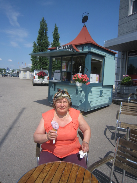 Baarin pihaan oli ilmestynyt ilmeisesti kesäkuun alusta alkaen Tampereen Jäätelötehtaan hieno jäätelö-ja kahvikioski. Kun oli kuuma, niin tietenkin ostimme jäätelöt ja nautimme ne ulkona baarin pihalla.