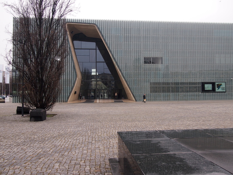 Keskipäivän aikaan otimme päärautatieaseman edustalta taksin ajaaksemme POLIN museoon, Puolan juutalaisten historian museoon. Museorakennuksen on suunnitellut suomalainen arkkitehtitoimisto Lahdelma & Mahlamäki. Museorakennusta sanotaan esitteissä arkkitehtuurin helmeksi. Kyllä se sitä onkin dramaattisine sisäänkäynteineen, runsaine lasipintoineen ja pullistelevine seinineen. Myös itse näyttely on hienosti toteutettu ja esillepano on nykyaikainen, paljon multimediatekniikkaa sisältävä.