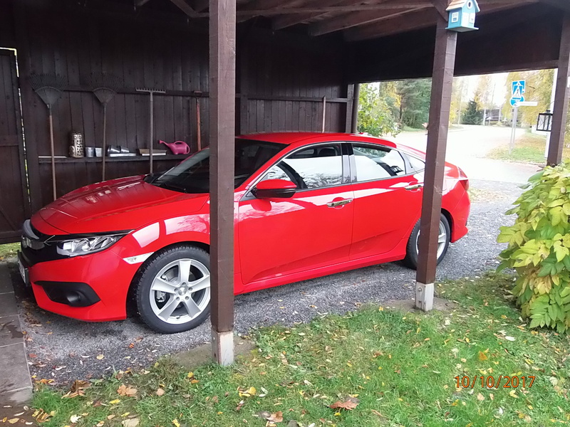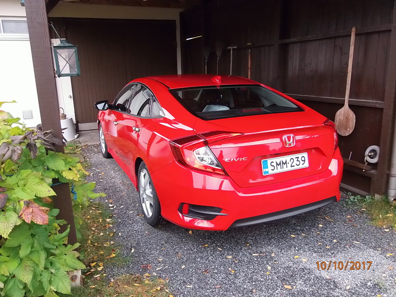Eeva-Leena totesi käydessämme katsomassa tilattua SUVia ykskantaan, että ei hän tuollaista ”Jeeppiä” aja. Niinpä minun oli peruttava tilaus ja aloitettava auton katsominen alusta. Päädyimme silloin juuri Suomen markkinoille tulleeseen Honda Civic´iin, joka oli ”kasvanut pituutta” parikymmentä senttiä. Ajattelimme, että auton takatilat ovat riittävän suuret meidän ja Viktorin tarpeisiin. Kyllä Honda Civic meille vallan hyvin riittää ja pystymme sillä kuljettamaan Viktoria ja ajelemaan Helsingin ja Tampereen väliä. Auto on väriltään punainen, kuten entinenkin. Eeva-Leena sai mieleisensä värin! Ehkäpä tämä alkaa jo olla viimeinen hankkimamme auto, kun tuota ikääkin alkaa meillä molemmilla olla jo melkoisesti!?