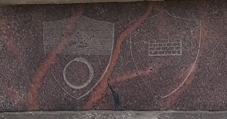 Suvun vaakunat on hakattu hautakammion oven päälle. Vasemmassa kilvessä on häntäänsä pureva käärme ja oikeassa linnoituksen muuri.